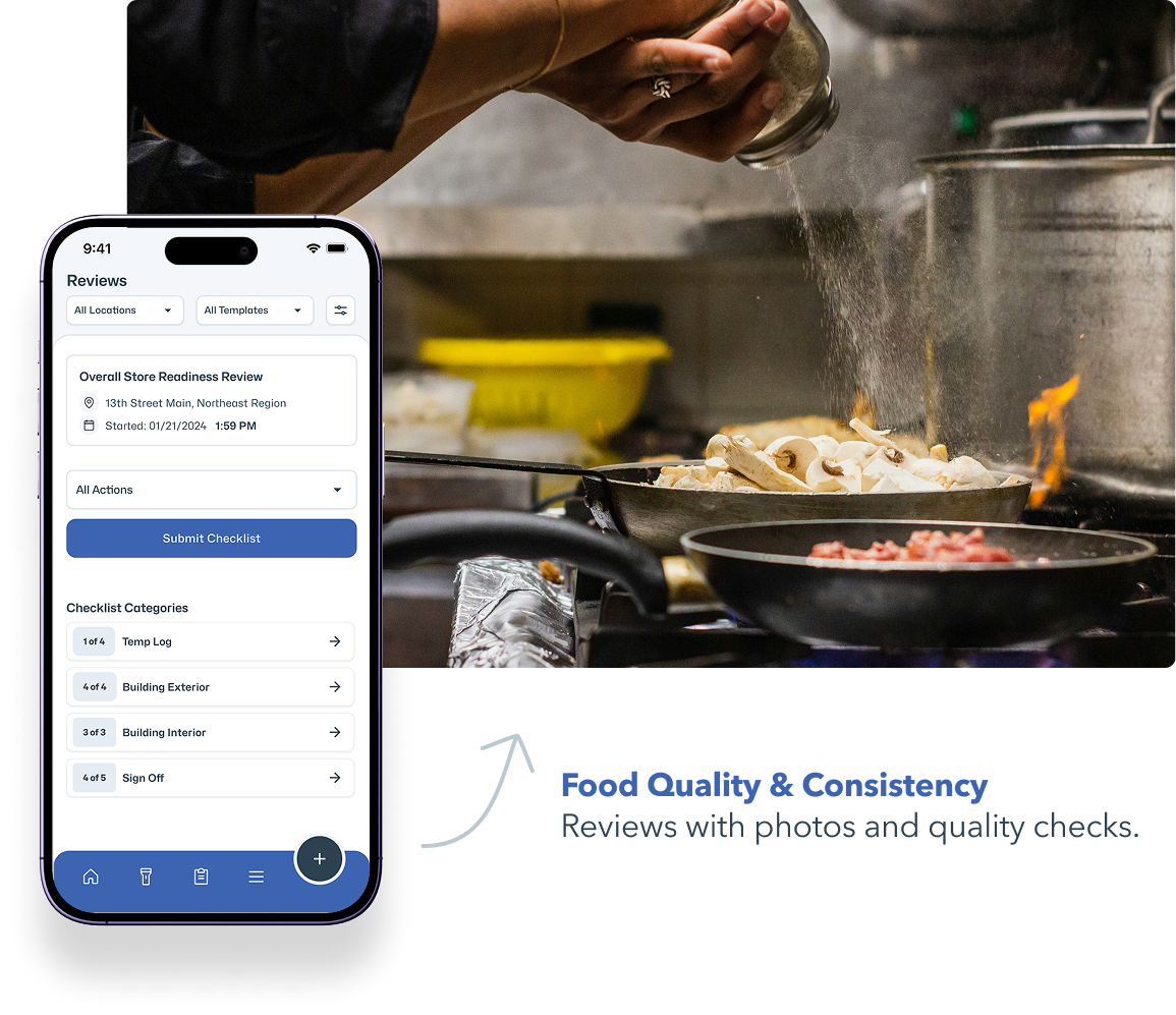 delivered through mobile-friendly checklists for sanitation, prep line readiness, and shift-based routines